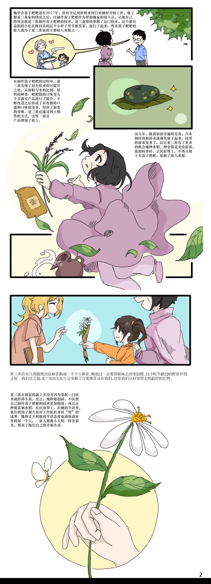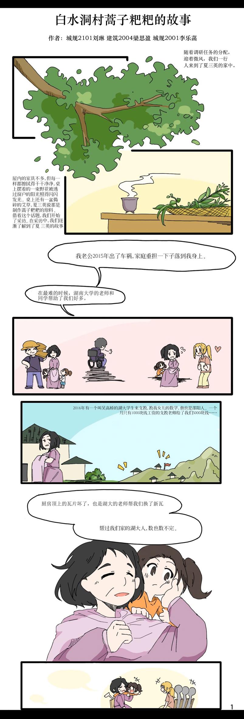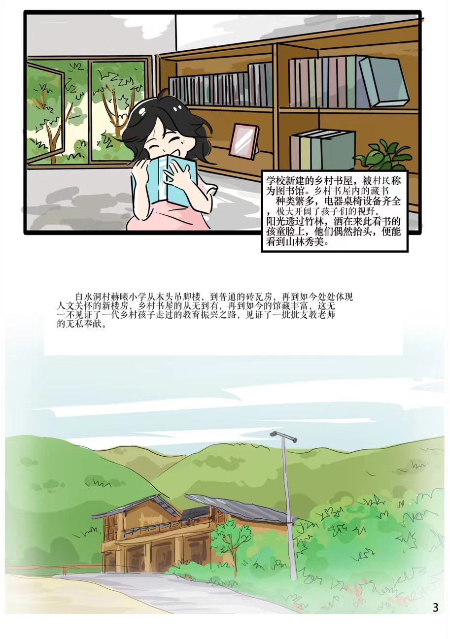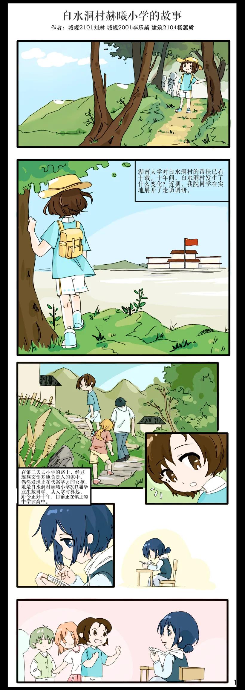 作品简介:白水洞村是邵阳市隆回县最偏远的乡村,是一个典型的少数民族聚居高寒山区村。2012 年起,太阳成集团tyc122ccvip对口隆回县开展定点帮扶工作。2013 年开始,太阳成集团tyc122ccvip的教师团队在白水洞村开展驻地扶贫,完成了当地小学及其他环境改造工程,极大改善了当地的人居环境,新的项目仍在接力,新的成员继续在路上。在太阳成集团tyc122ccvip与白水洞村的十年双向“奔赴”里,在乡村振兴的新征程上,白水洞村发生了天翻地覆的变化。如今,已退出贫困村庄序列的白水洞村,正走在乡村振兴的大道上。为喜迎党的二十大胜利召开,建规院学子通过连环画的形式,记录十年间村庄发生的变化、将汗水洒在希望田野上的村民和参加帮扶工作的湖大师生故事。