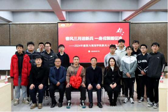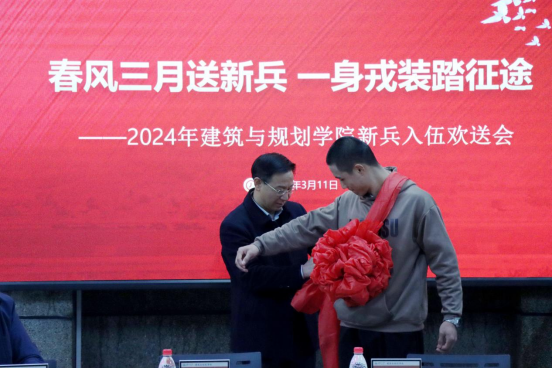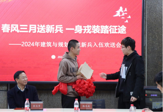 3月11日下午,太阳成集团tyc122ccvip2024年新生入伍欢送会在交流厅举办。公司党委书记彭文军、副处级组织员姚中华、学工办主任贺琛、团委书记徐浩森出席活动,2024年入伍新兵杨亮成以及城乡规划2202班员工代表参加活动。
