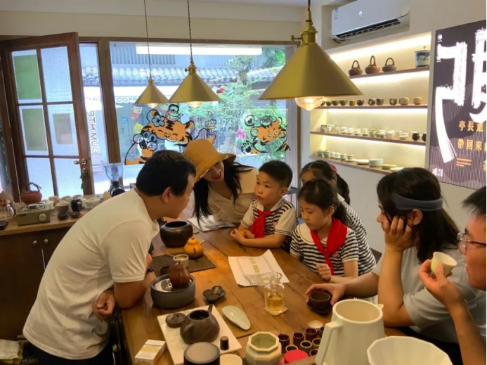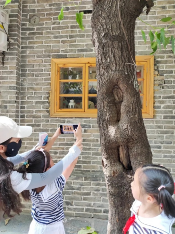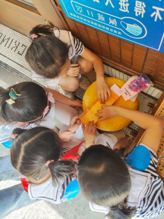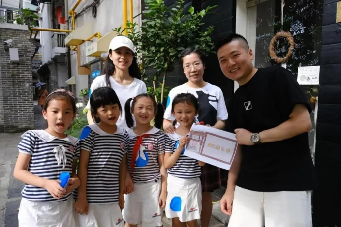 最后一个环节是“传递色彩”,六个小组被分为了三个大组,将打印出来的门牌送给对应的商铺。孩子们亲手将由自己全程参与设计色彩的门牌递到了店主的手里,并积极让店主参与到对自己作品的评价当中。